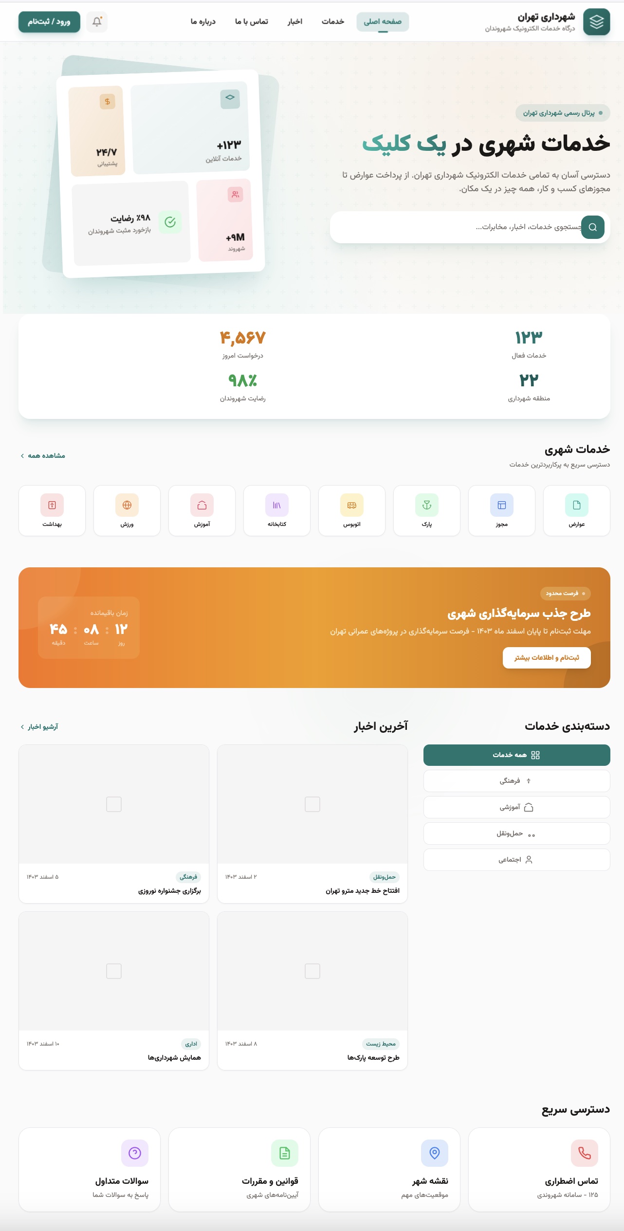 قالب شهرداری الکترونیک یک قالب تخصصی وردپرس است که بهطور اختصاصی برای سازمانهای شهرداری، نهادهای دولتی و پرتالهای خدمات الکترونیک طراحی شده است. این قالب با ترکیب زیباییشناسی مدرن و عملکرد حرفهای، تجربهای بینظیر برای شهروندان و مدیران سیستم فراهم میکند.